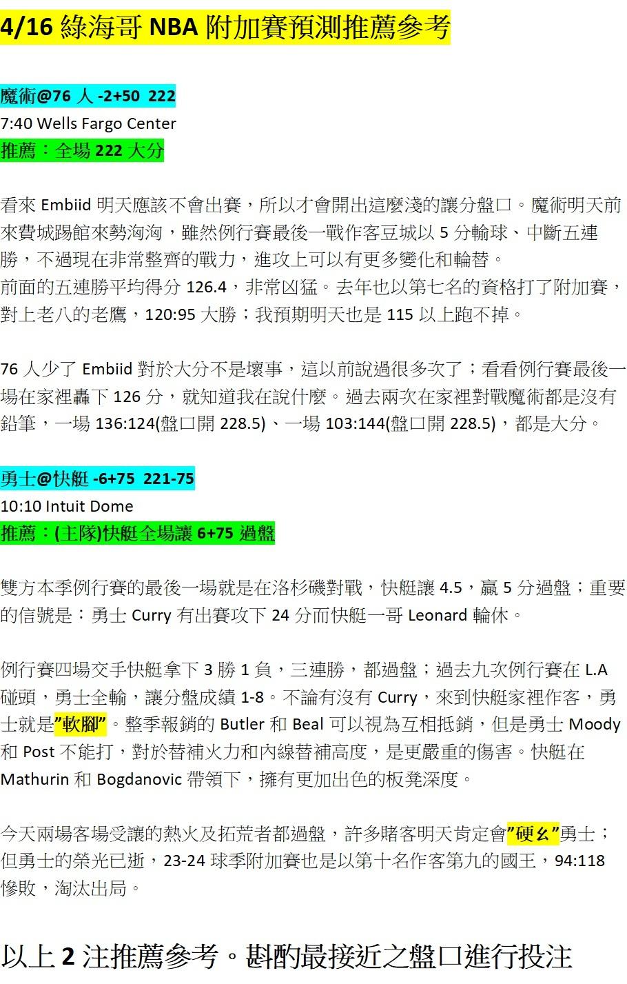 >> 4/16 綠海哥NBA兩場預測參考。單純分享,輸贏自負。今天推二過二(留言無回覆,見諒)