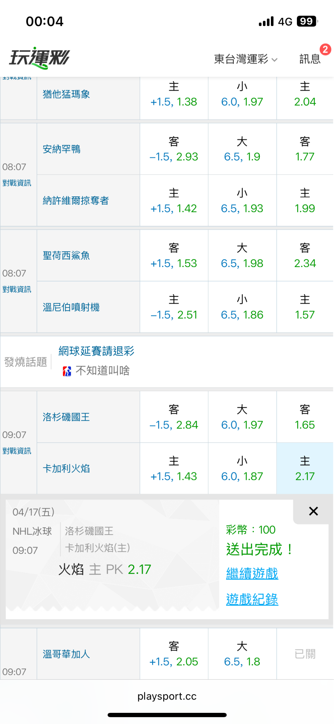 >> 4/17東台NHL國際盤【近40日贏34日】主推信心滿滿(貓場)特價用完了 喜歡的跟上東台~