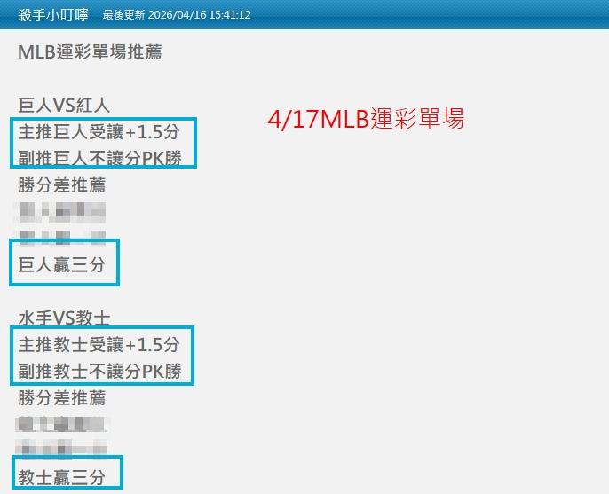 MLB >> 4/18MLB今小叮嚀推薦2場單場:巨人受讓+PK+贏三分勝分差&教士受讓+PK+贏三分勝分差都過