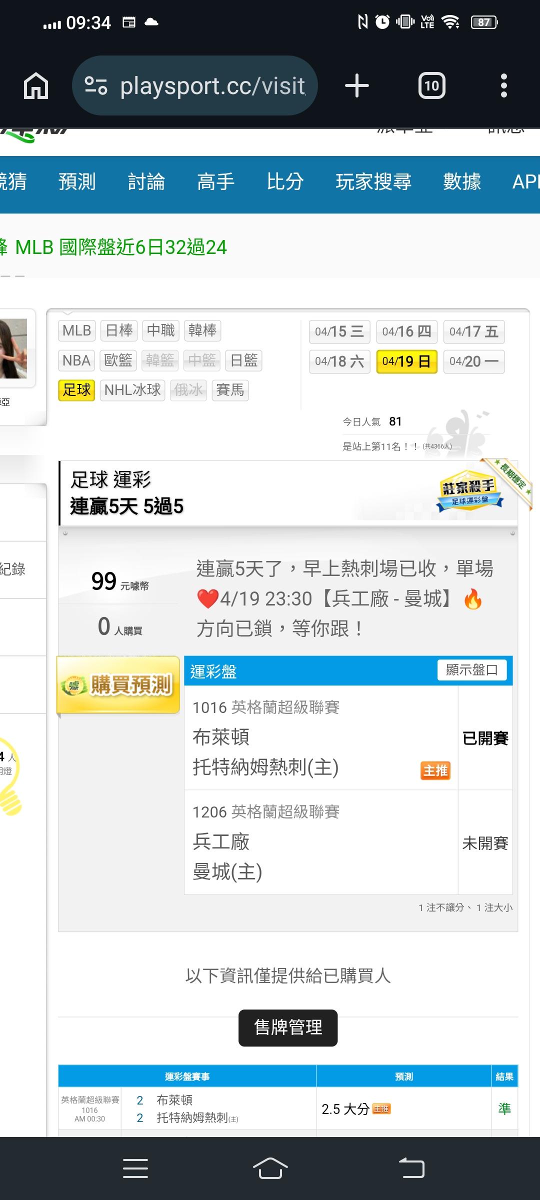 >> 連贏5天了,早上熱刺場已收,單場❤️4/19 23:30【兵工廠-曼城】🔥方向已鎖,等你跟!