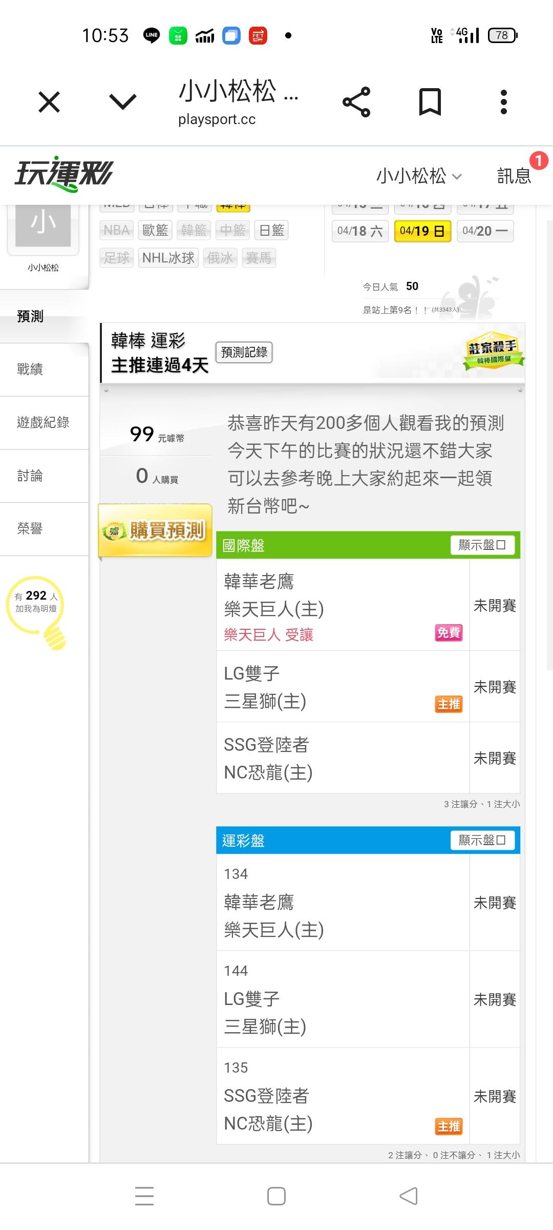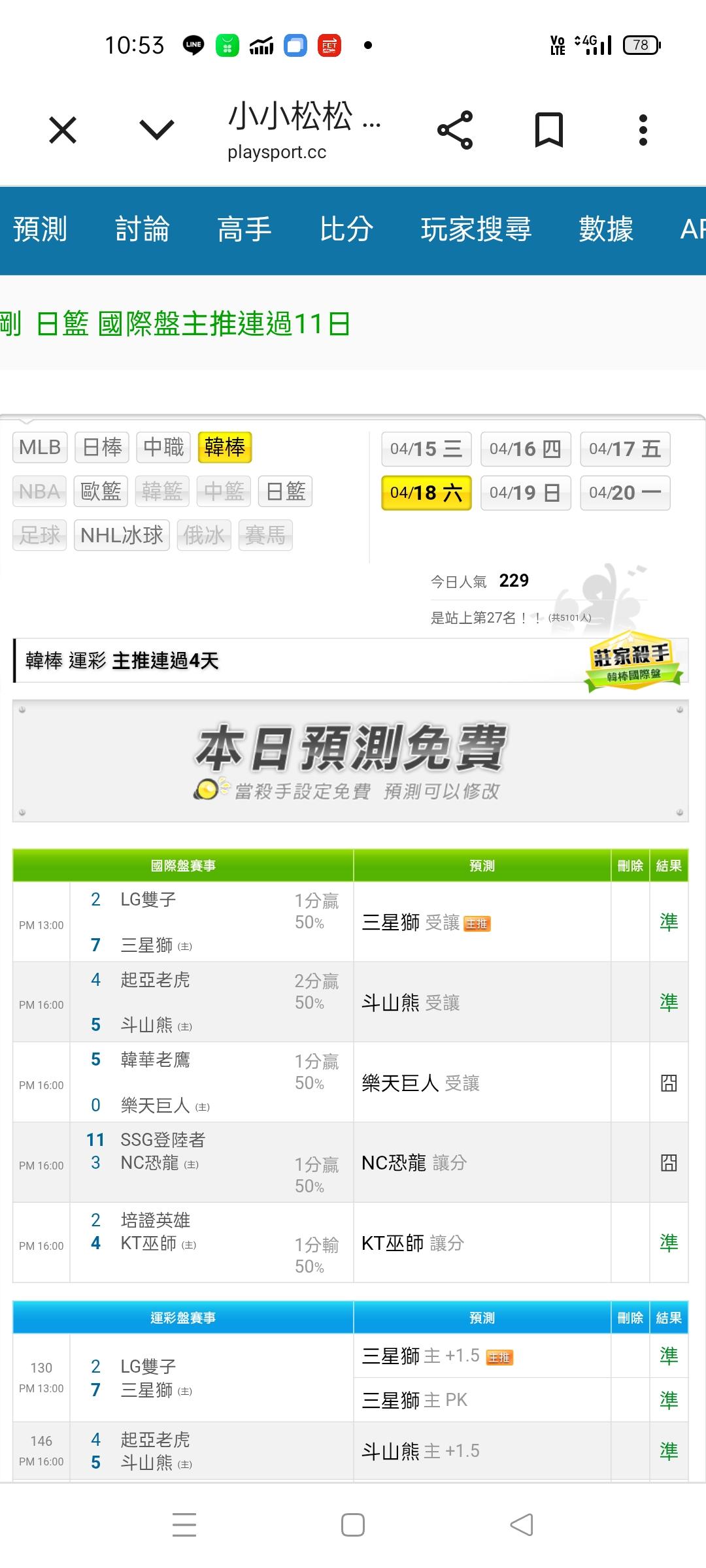 韓國職棒 >> 溫馨提醒大家因為快要開賽了也很恭喜昨天有200多個人觀看我的預測今天我非常看好這幾場比賽大家過盤