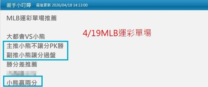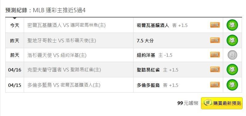 MLB >> 4/20MLB運彩主推近5過4 今天小叮嚀推薦單場:小熊PK+讓分+贏2分勝分差都抓到 明2場單場