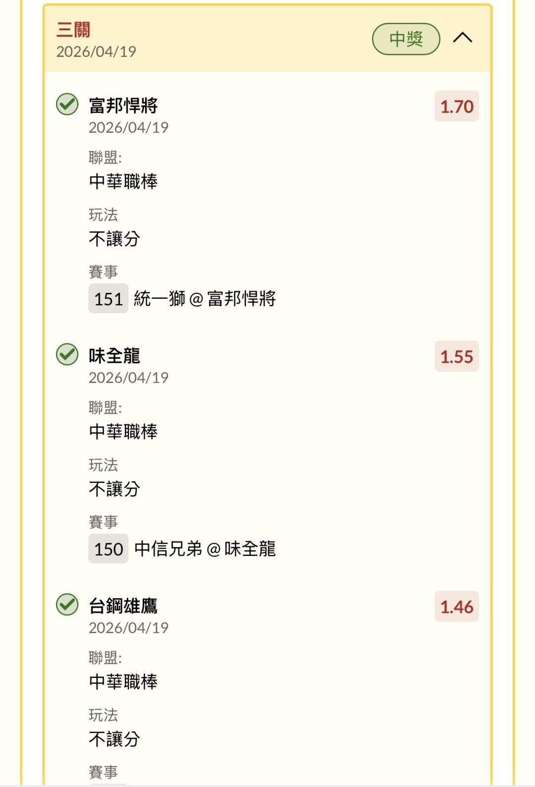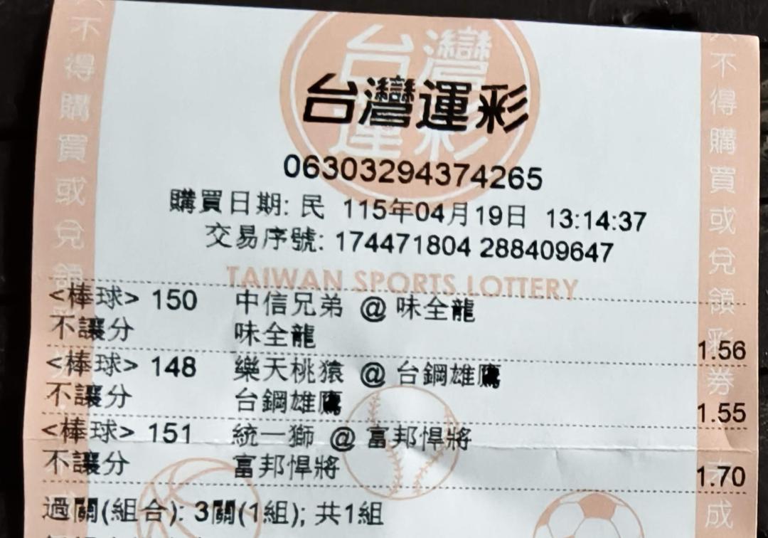 美棒我不敢玩,中職比較好猜,前兩年有富邦,今年有兄弟,贏三次輸一次都划算。 |