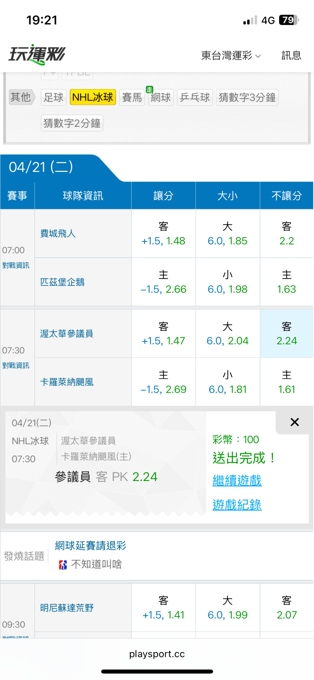 >> 4/21東台NHL國際盤【近43日贏37日】主推信心滿滿(貓場)特價79 喜歡的跟上東台~