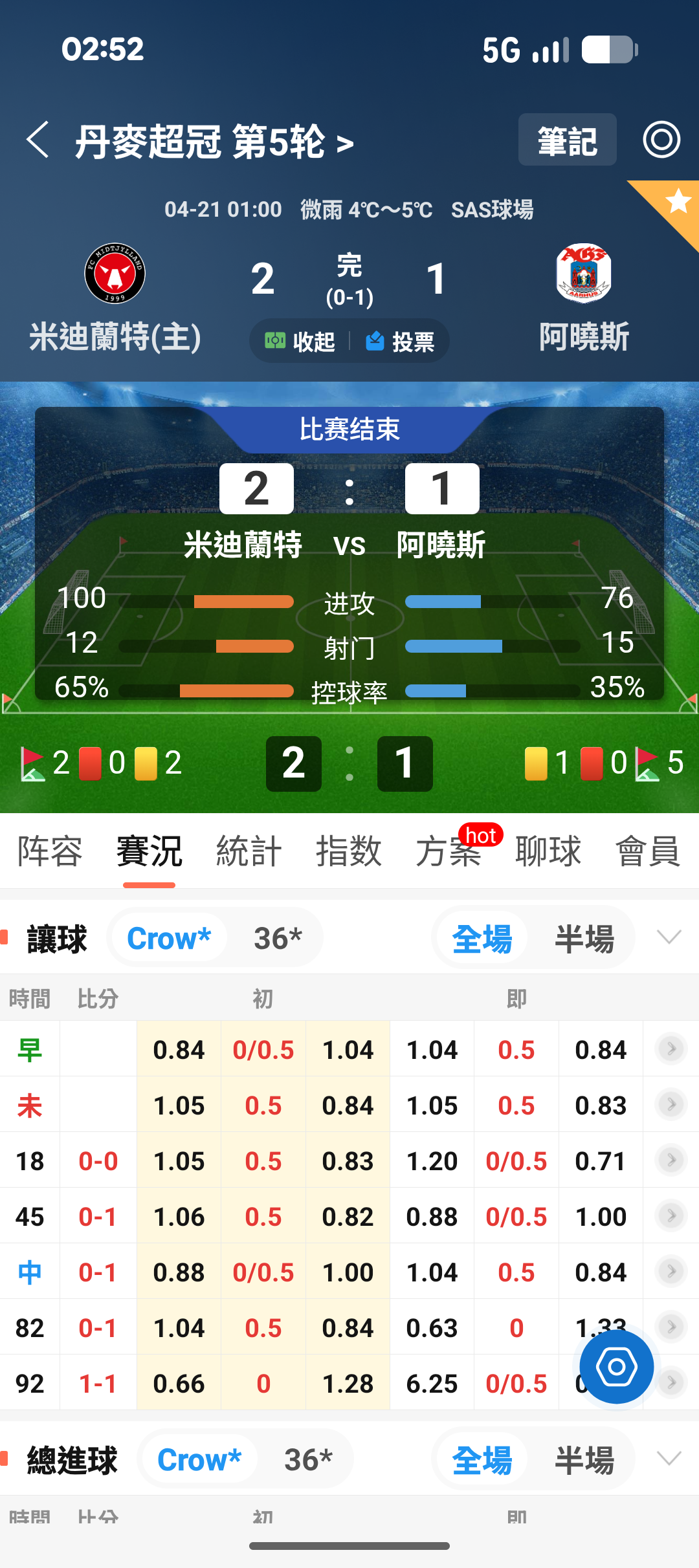 足球 >> 1:00丹麥超 奧胡斯 中日德蘭 正比