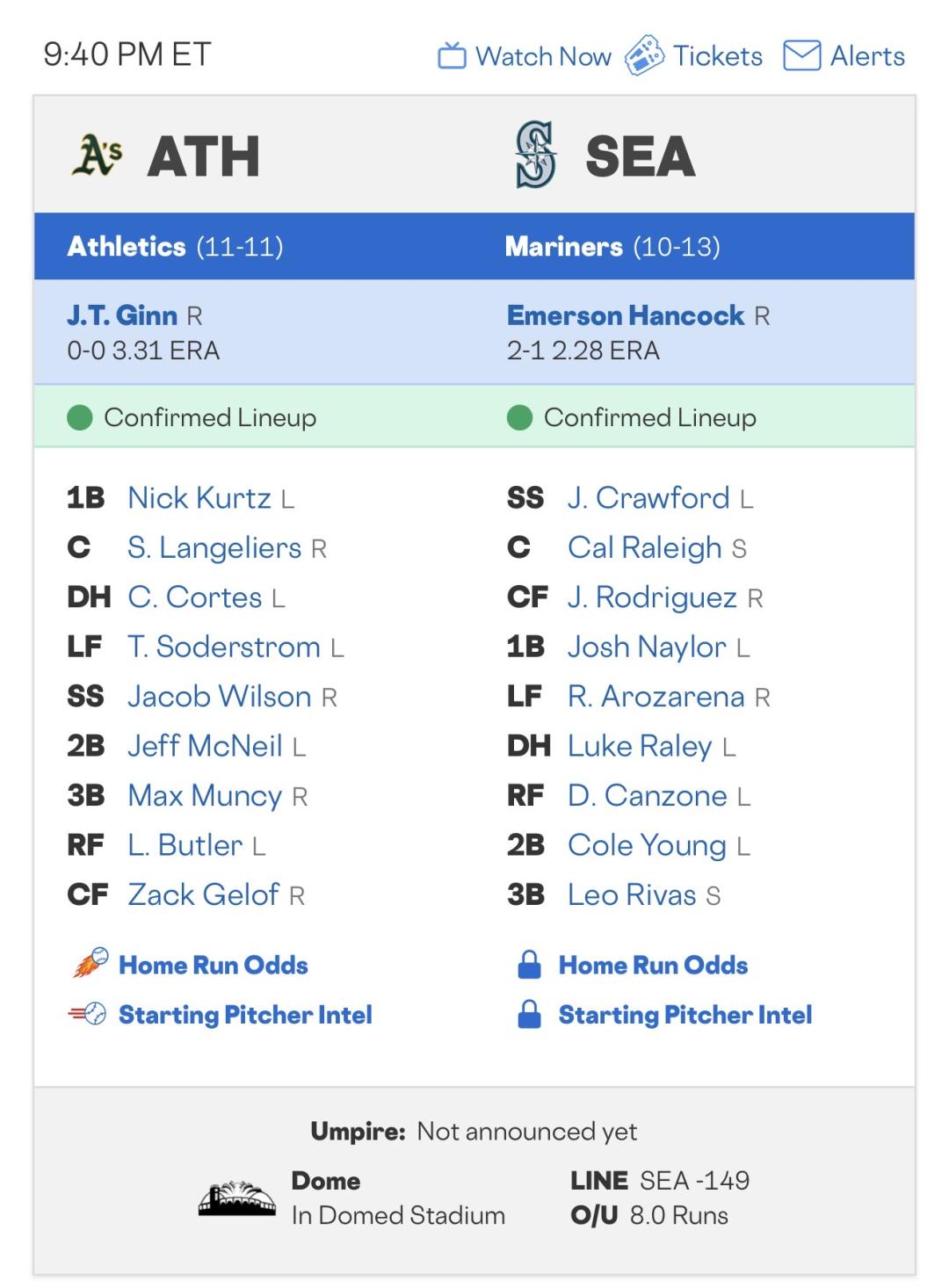 >> 單場 - 運動家 VS 西雅圖水手「資金比例+先發名單」