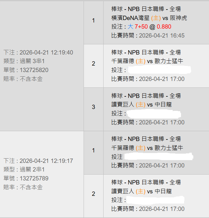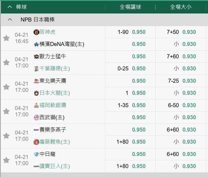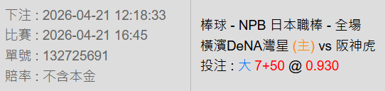 日本職棒 >> 4/21【16:45=阪神VS橫濱】初盤分享+大分版路推薦!