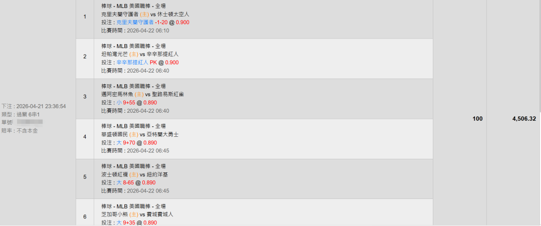 4/22 MLB 6*1 分享!喜歡的朋友請隨意享用!祝大家都能順利過關!!!