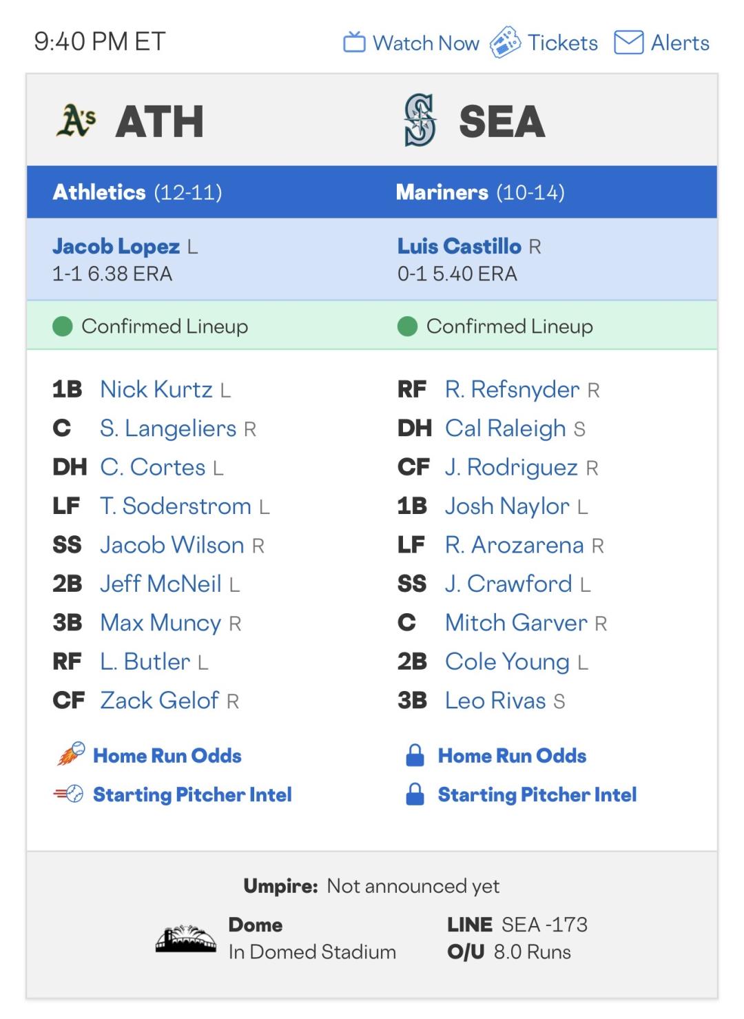 >> 單場 - 運動家 VS 西雅圖水手「資金比例+先發名單」