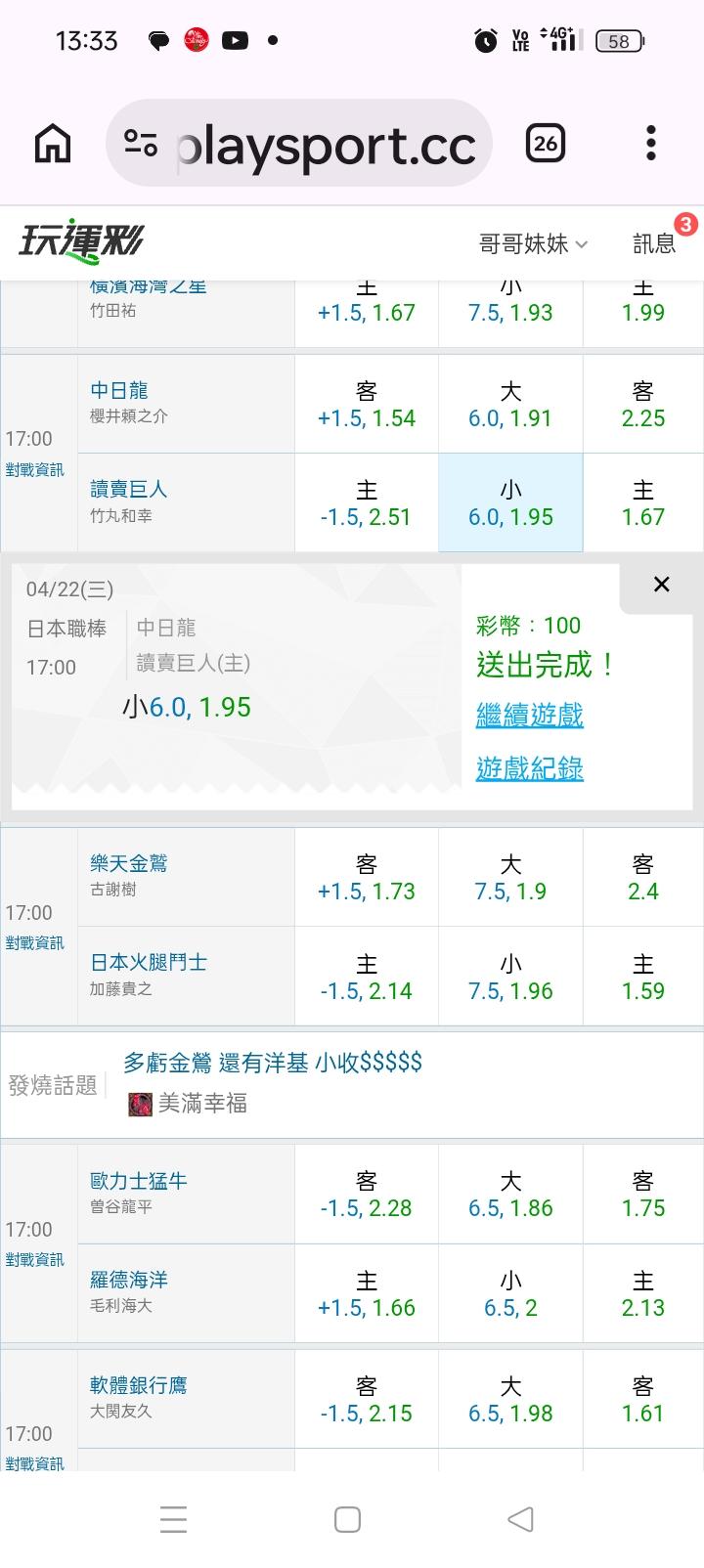 日本職棒 >> 國際連贏三天,運主推三連勝台彩單場連續贏錢,單場大小輸贏🤩