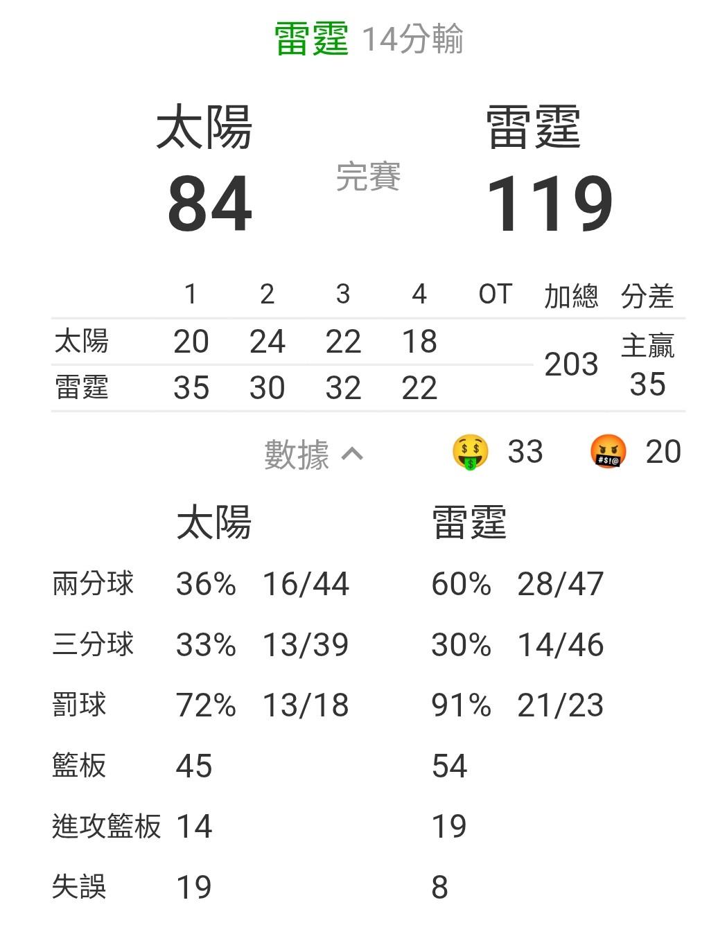 請看圖 雷霆以119分 打爆了太陽的84分 狂贏35分