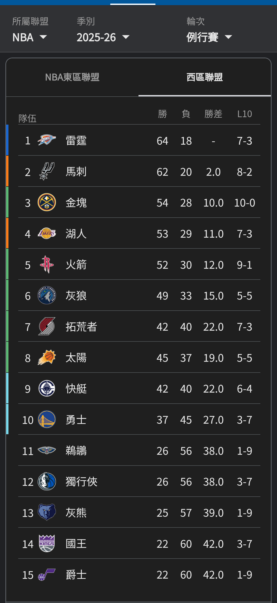 請看圖 雷霆在例行賽 以64勝 18敗 拿到了西區第一名的位置