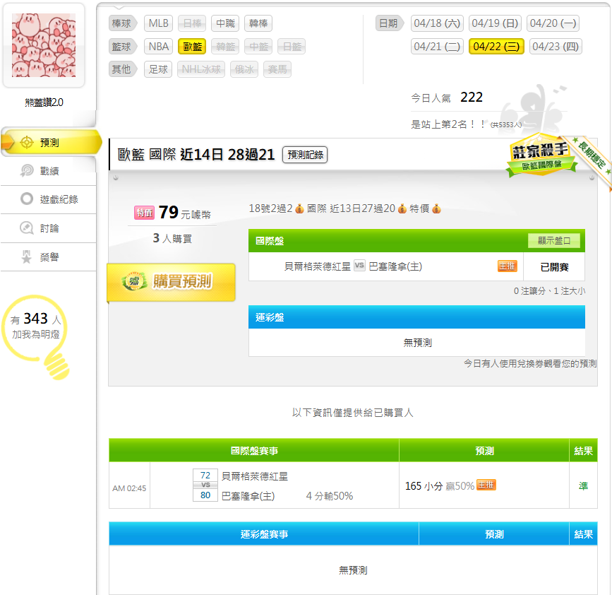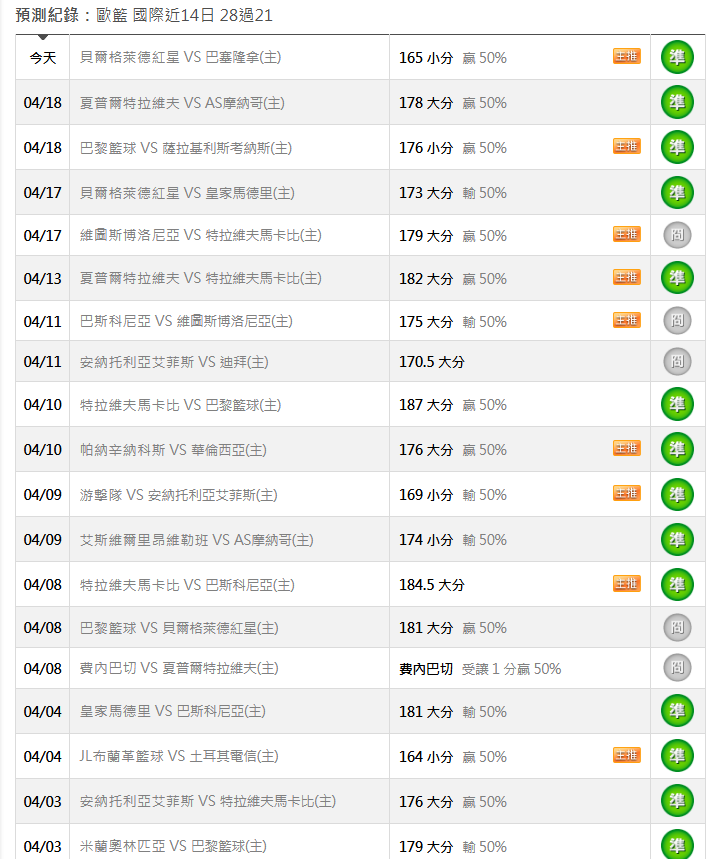 歐洲職籃 >> 4/23 昨天孤支又贏了💰國際近14日28過21💰特價💰