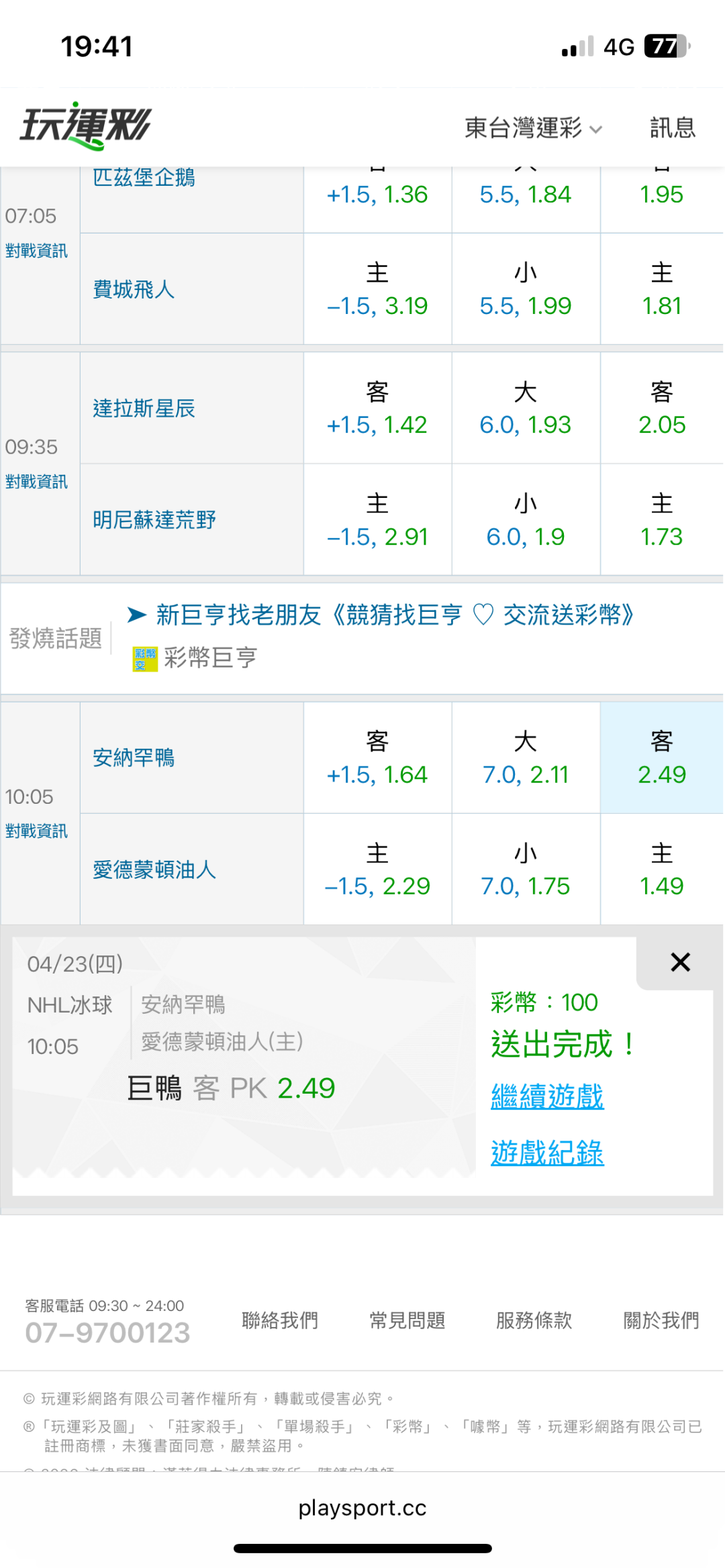 >> 4/23東台NHL國際盤【近45日贏39日】主推信心滿滿(貓場)特價79 喜歡的跟上東台~