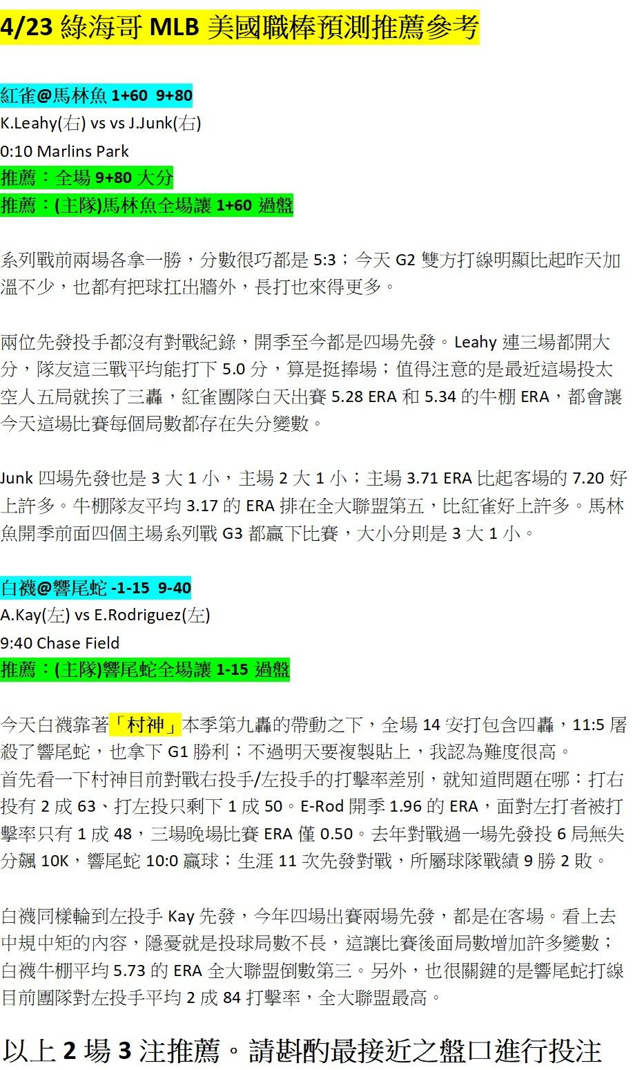 >> 4/23 綠海哥MLB三注預測參考。單純分享,輸贏自負。主推13過11(留言無回覆,見諒)