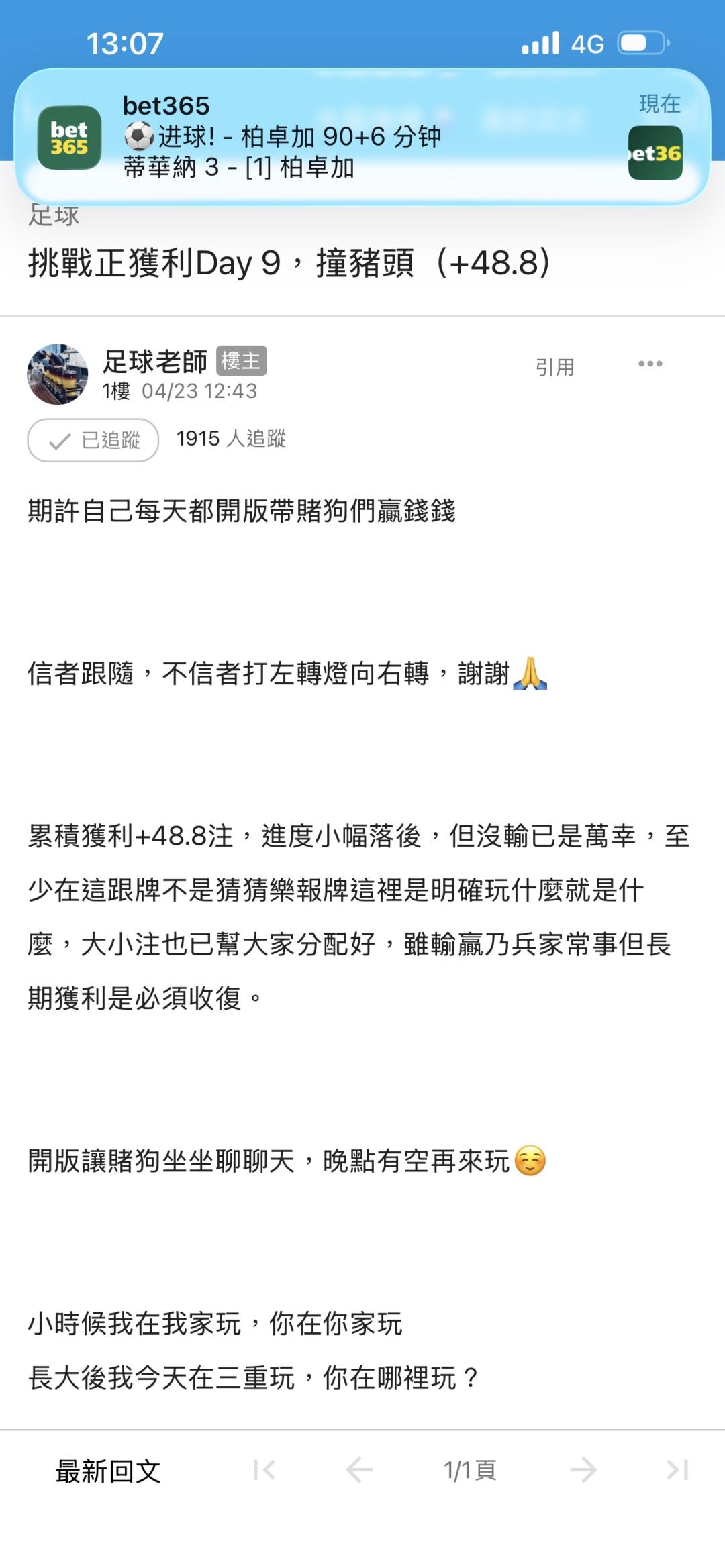 足球 >> 挑戰正獲利Day 9,撞豬頭(+48.8)
