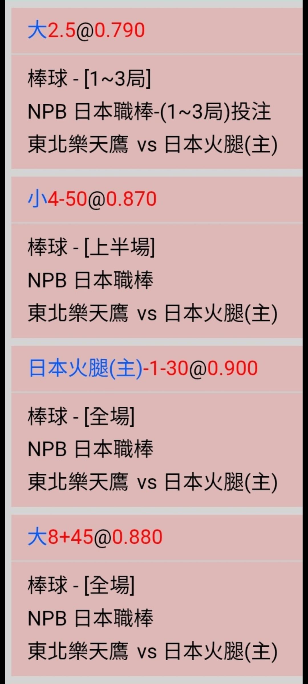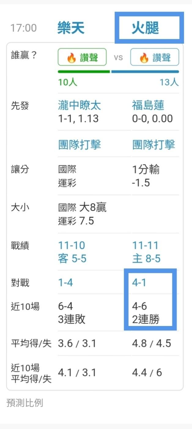 2連勝,打樂天4勝1敗,樂天近況不好,3連敗,追贏不追輸,火腿大隻的好吃!