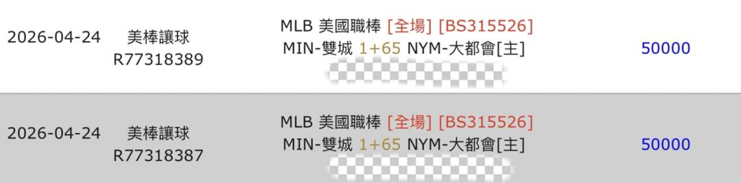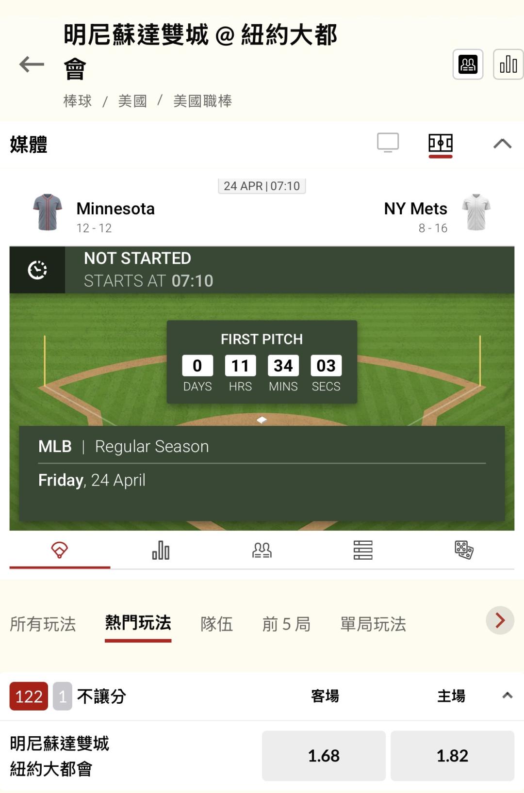 MLB >> 你們最愛的「單場 新台幣 10萬」明尼蘇達雙城 @ 紐約大都會,運彩盤連贏2天6過6全贏贏贏贏贏贏