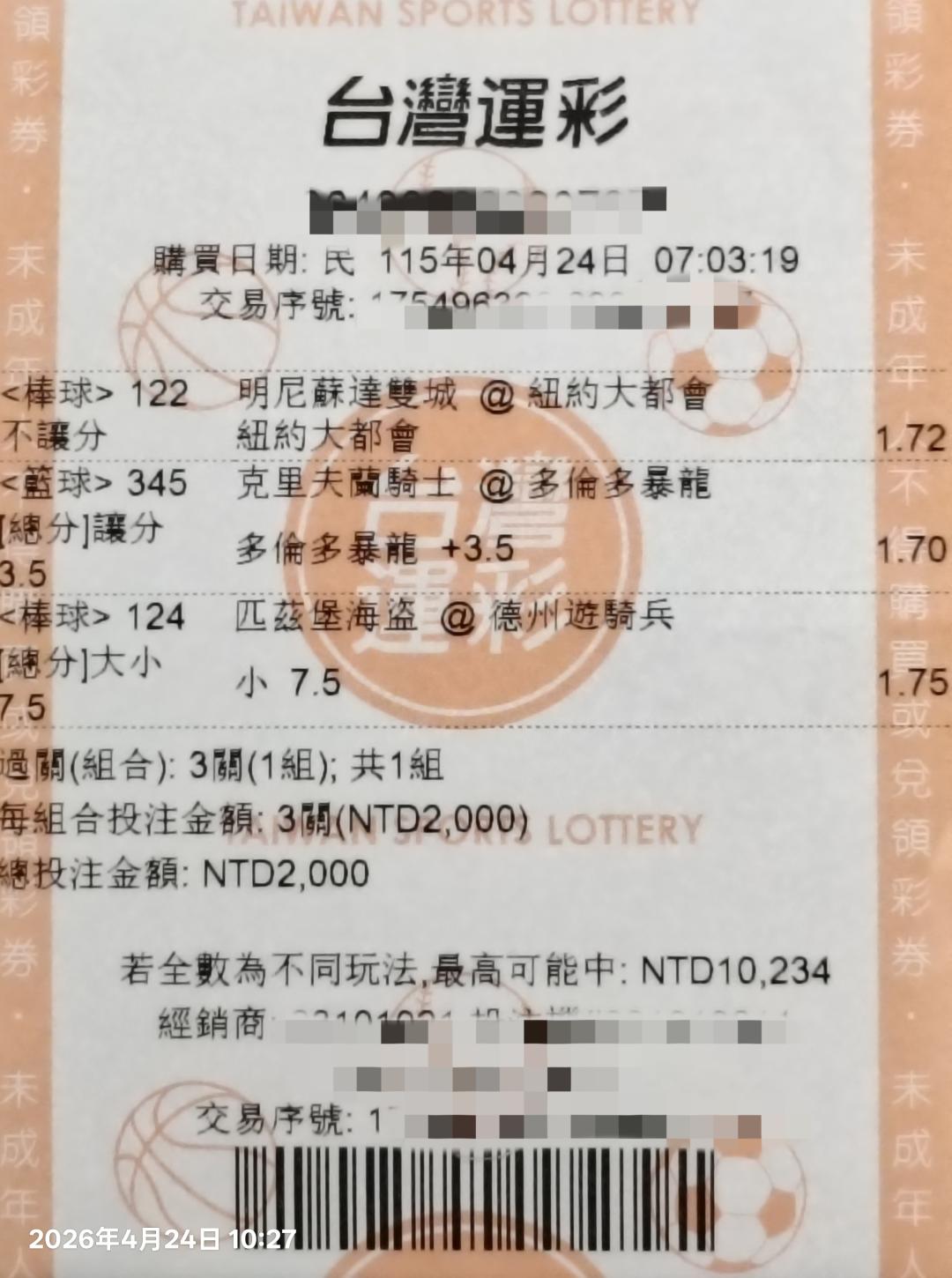 我今天的兩次下注運彩共7千元...