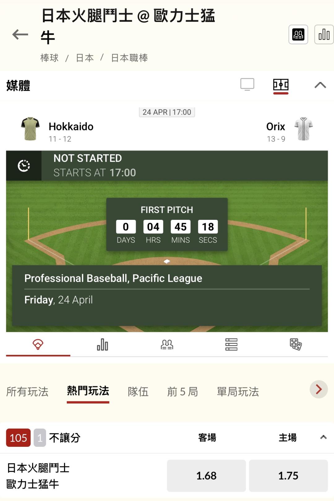 日本職棒 >> 你們最愛的「單場 新台幣 10萬」日本火腿鬥士 @ 歐力士猛牛,國際主推近14場過11場,豪爽