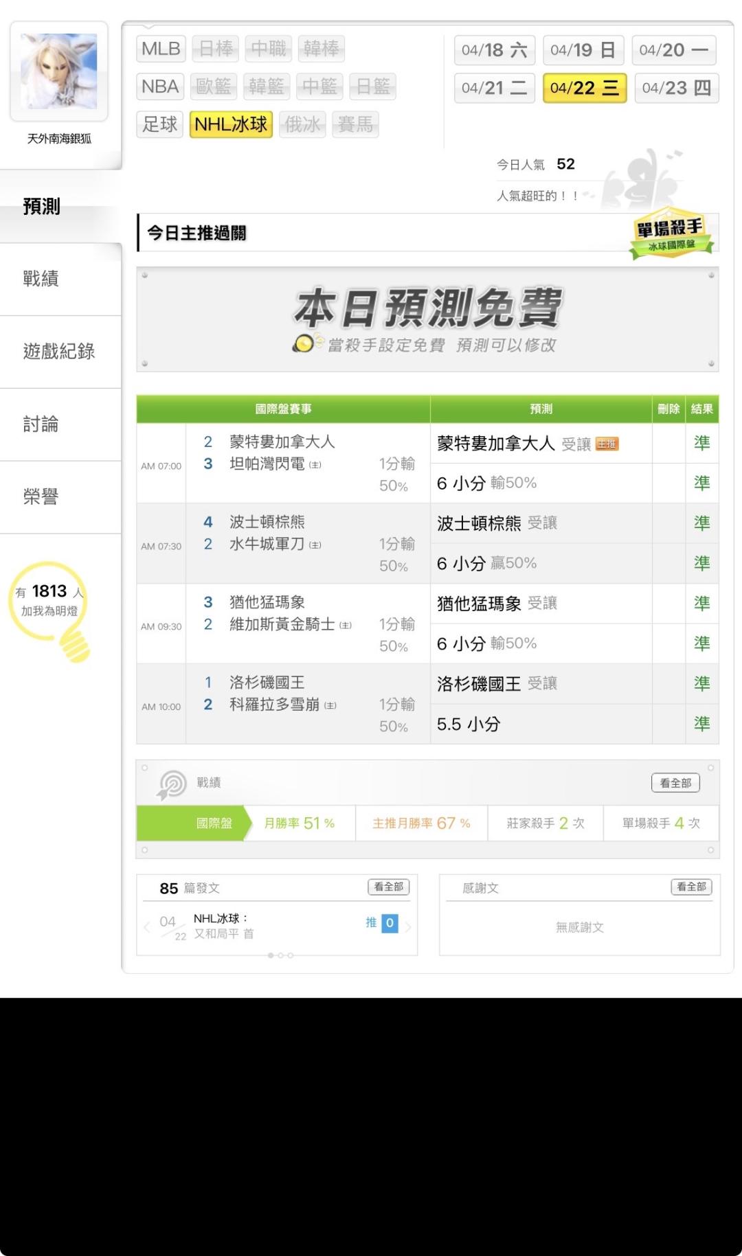 NHL冰球 >> 昨天4過4全壘打今天1過1【主推41過36】