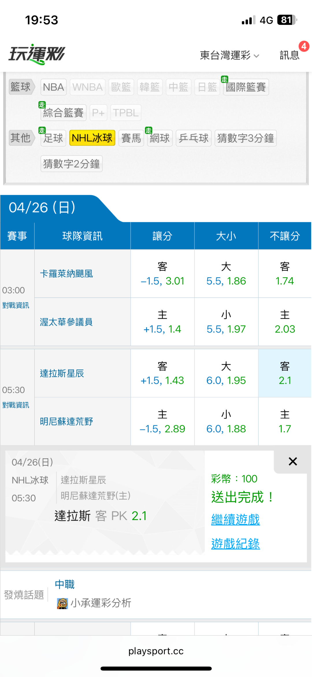 >> 4/26東台NHL國際盤【近48日贏42日】主推信心滿滿(貓場)特價79 喜歡的跟上東台~
