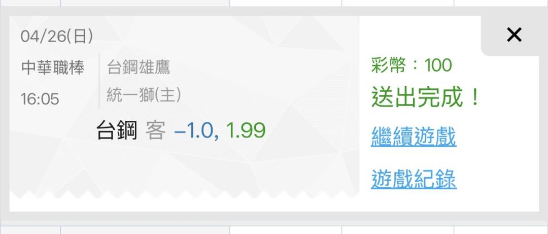 中華職棒 >> $$4/26 主推單場賽事。主推連過4天。本周16過13