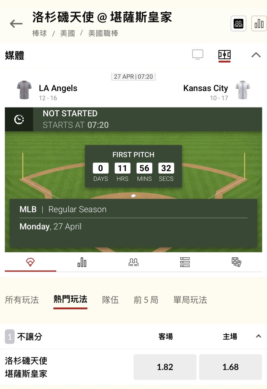 MLB >> 你們最愛的「單場 新台幣 10萬」洛杉磯天使 @ 堪薩斯皇家,你要跟我一起虐嗎?