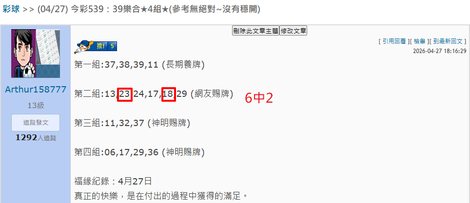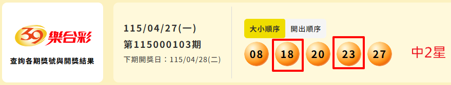 >> (04/27) 今彩539:39樂合★4組中1組2星★連中2期