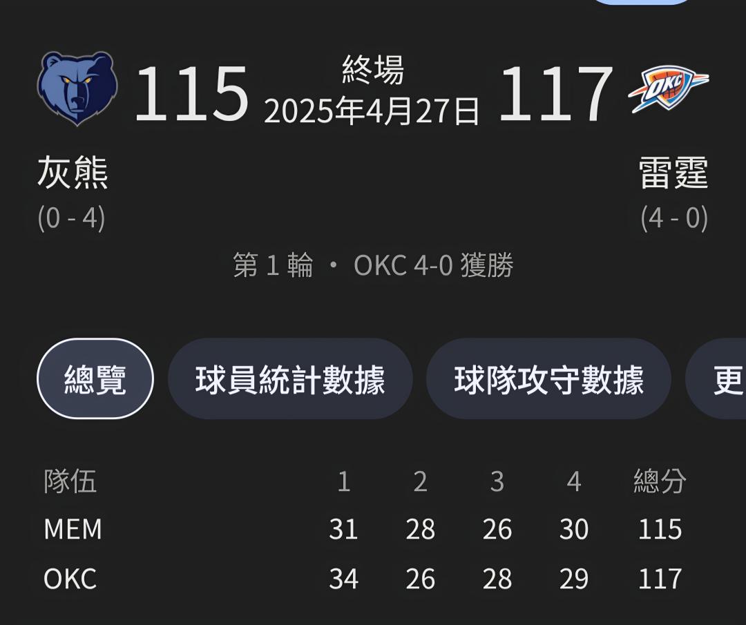 去年季後賽第一輪雷霆打灰熊4:0晉級