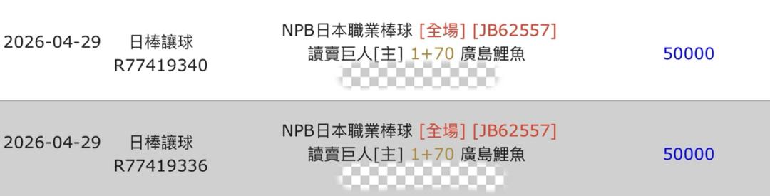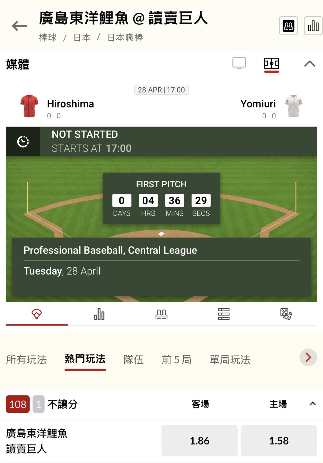 日本職棒 >> 你們最愛的「單場 新台幣 10萬」廣島東洋鯉魚 @ 讀賣巨人,上一個比賽日收國際主推10萬,豪爽