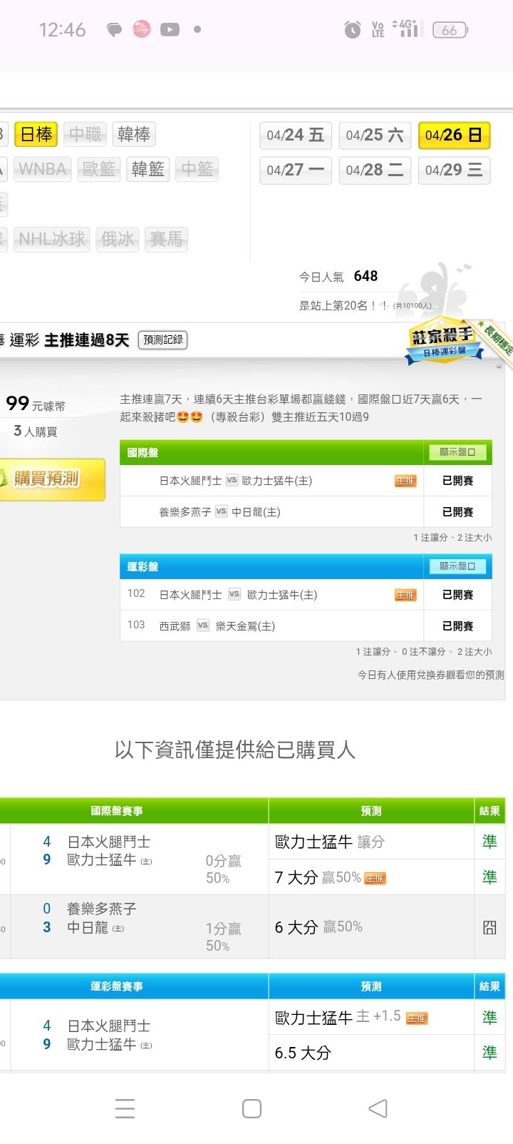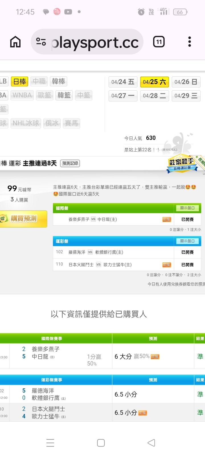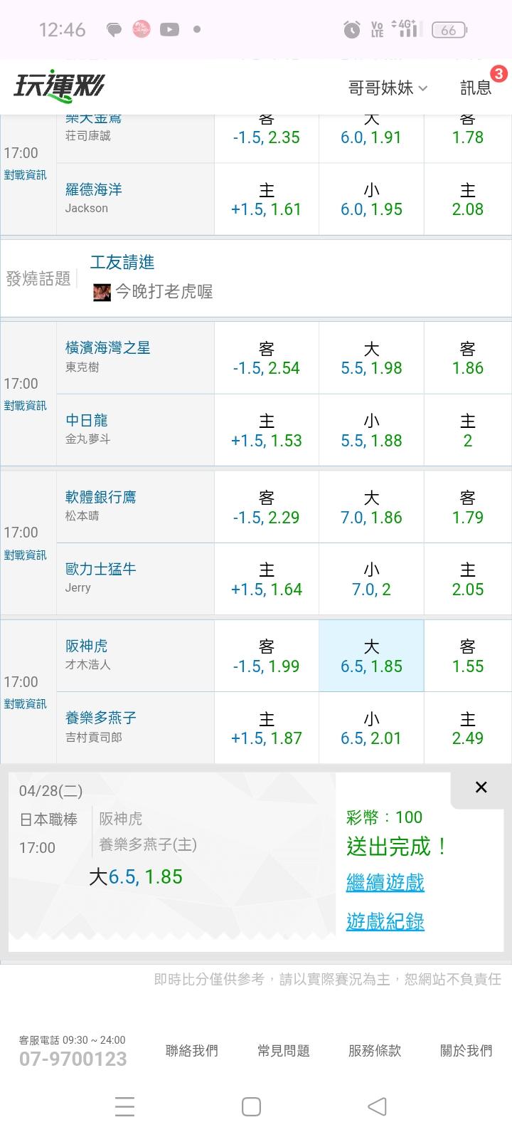日本職棒 >> 主推連贏8天(台彩單場大小輸贏) 雙主推近六天12贏11