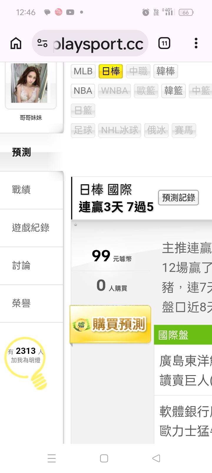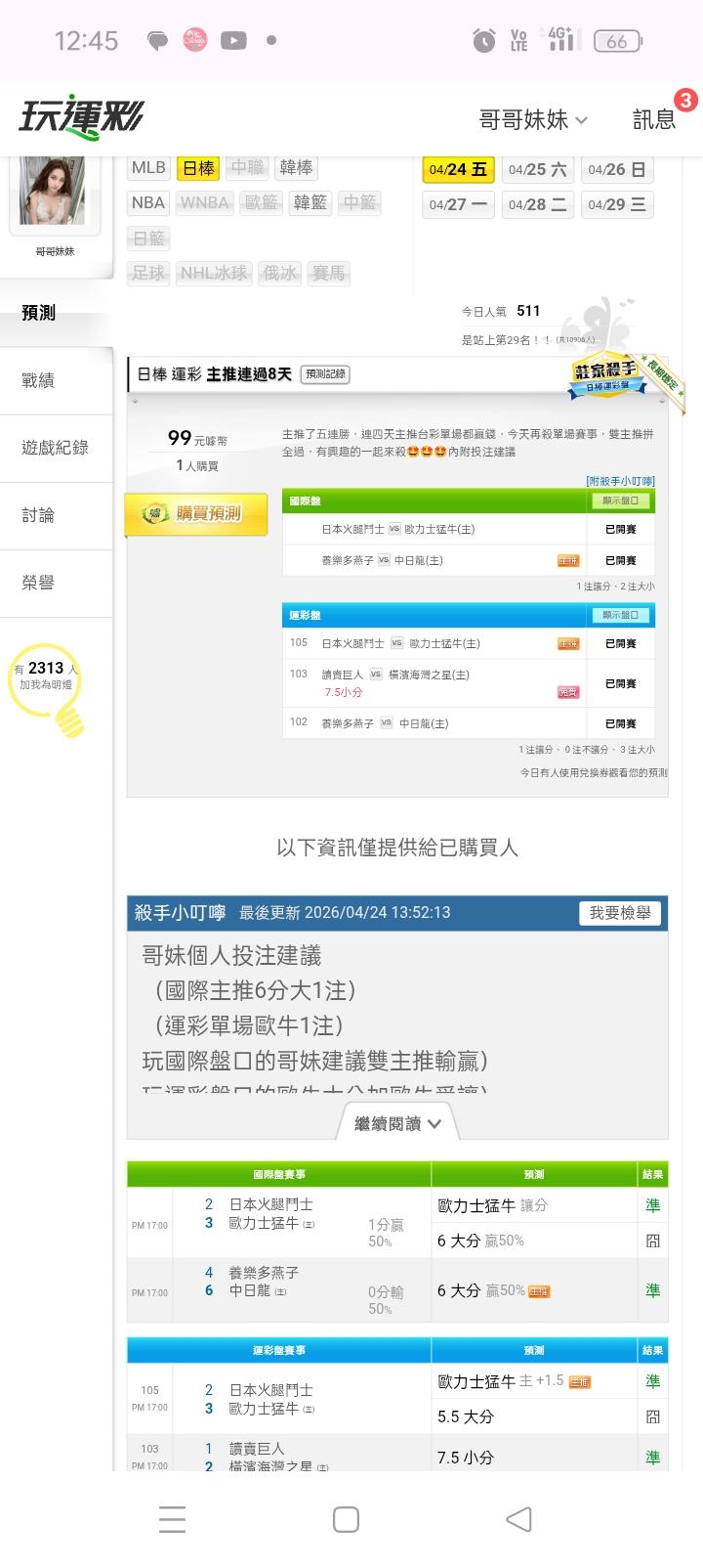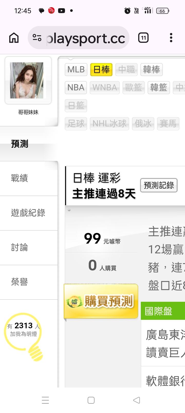 日本職棒 >> 主推連贏8天(台彩單場大小輸贏) 雙主推近六天12贏11