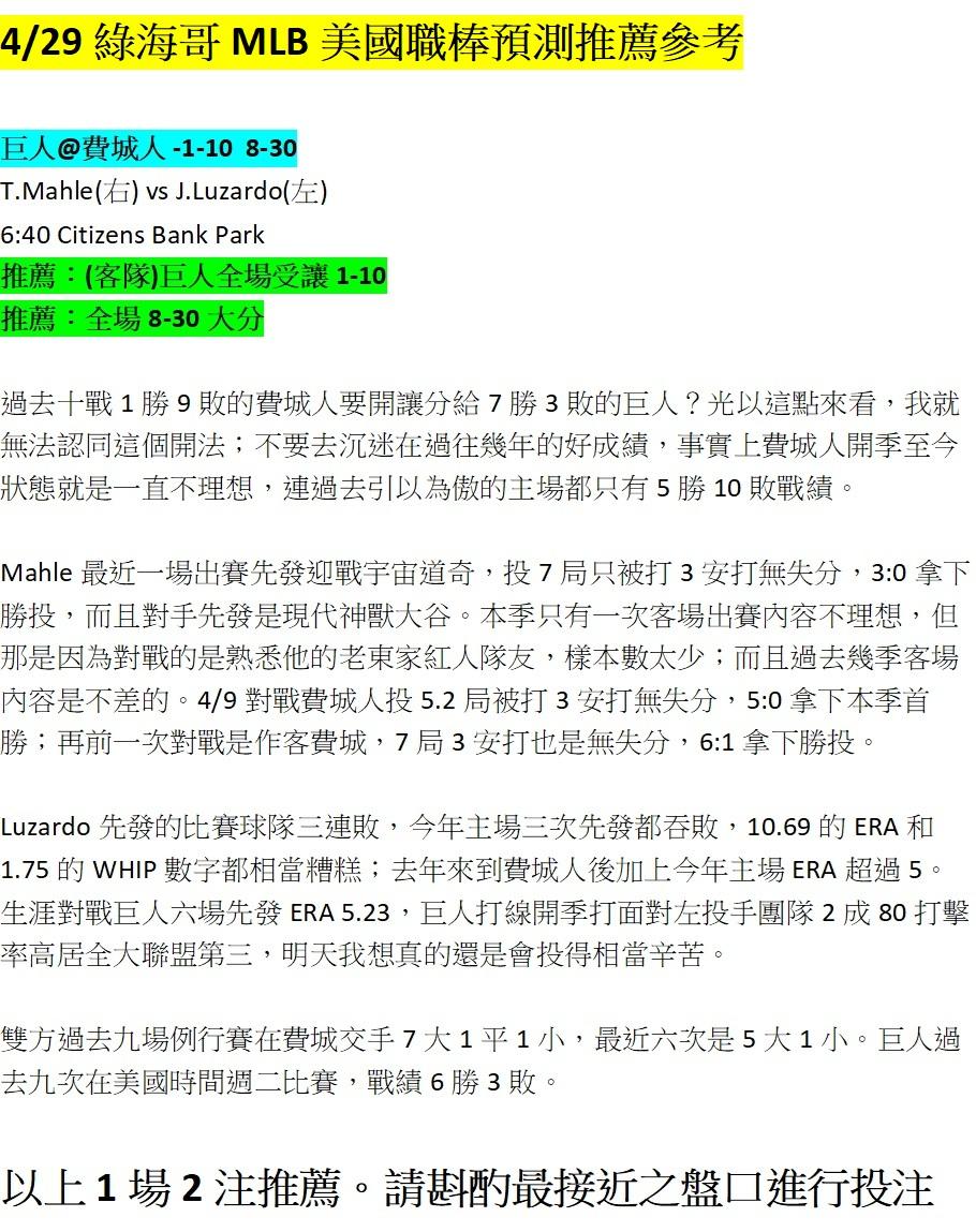 >> 4/29 綠海哥MLB兩注預測參考。單純分享,輸贏自負(留言無回覆,見諒)