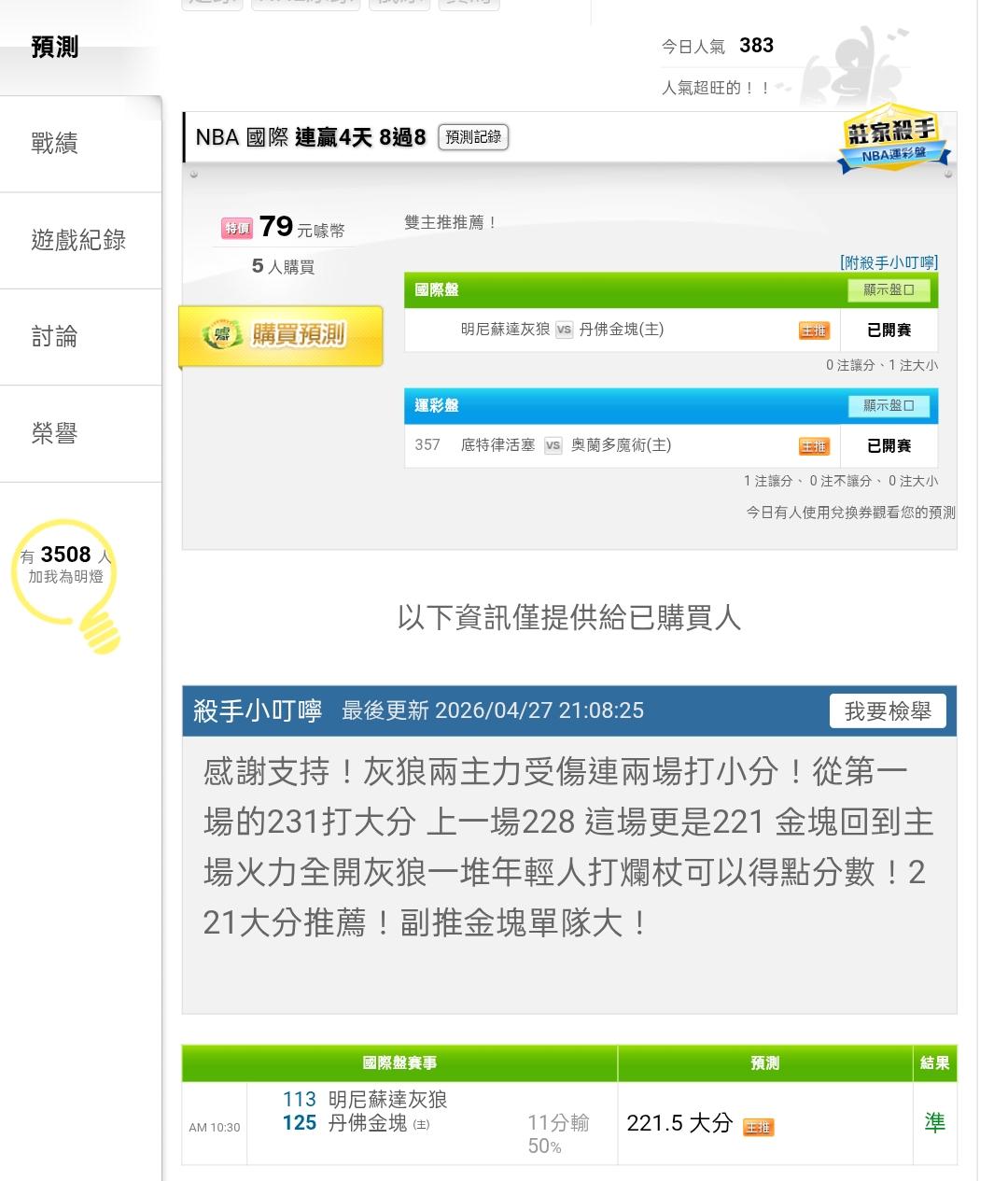昨天金塊灰狼大分如小叮嚀所言命中!!! |