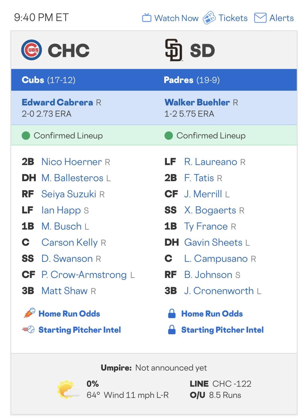 >> 單場 - 芝加哥小熊 VS 聖地牙哥教士「資金比例+先發名單」