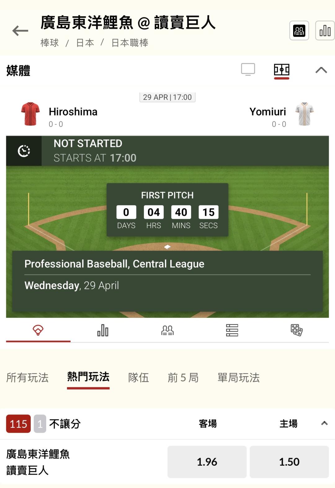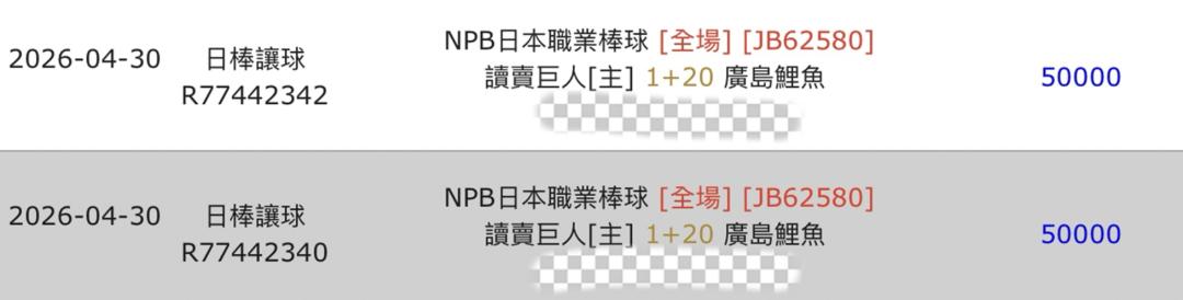 日本職棒 >> 你們最愛的「單場 新台幣 10萬」廣島 @ 巨人,國際連贏2天3過3,昨日雙盤5過5全贏