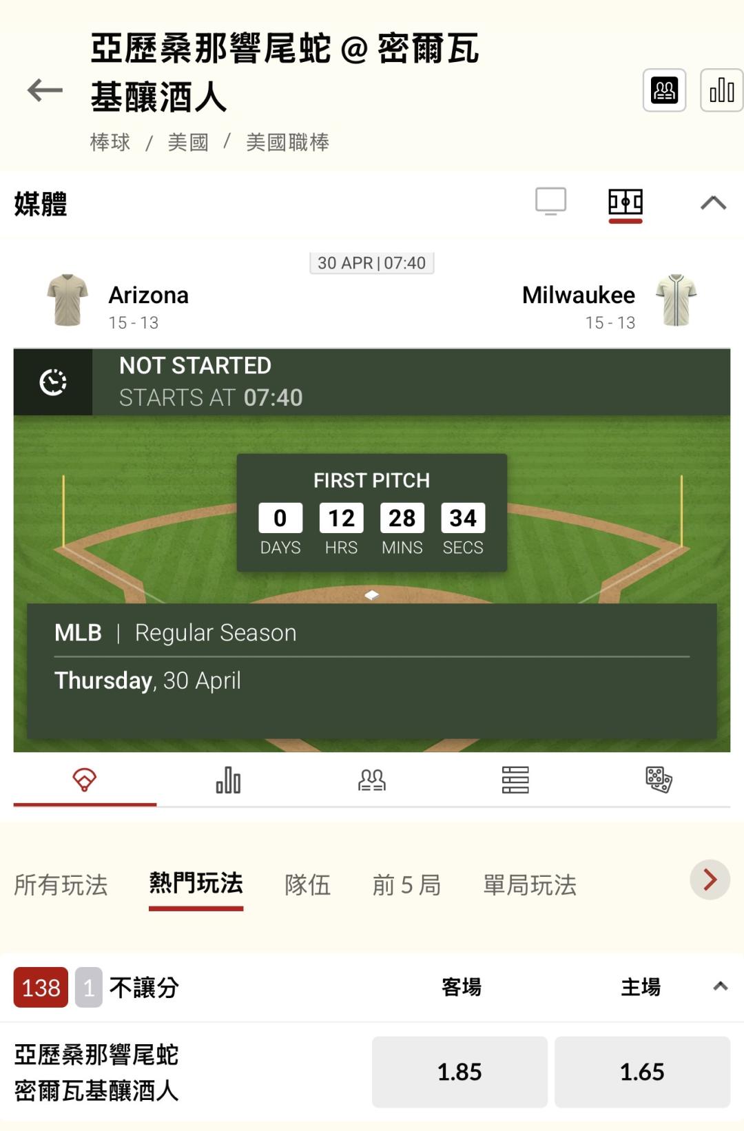 MLB >> 你們最愛的「單場 新台幣 10萬」亞歷桑那響尾蛇 @ 密爾瓦基釀酒人,國際連贏3天6過6全贏