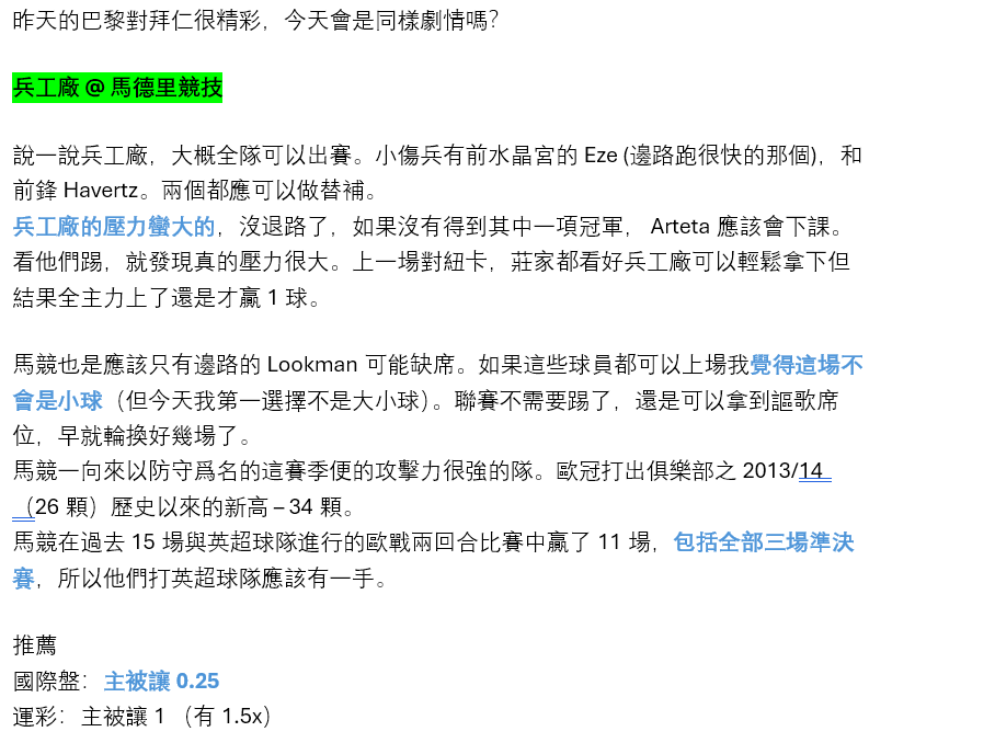 足球 >> 【MOFU足球預測】欧冠半决赛 - 兵工廠 @ 馬德里競技