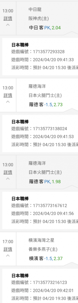 >> 2024年04月20日 日本職棒:[巨龍雙海雙鷹]或可嘗試[複合式串關]